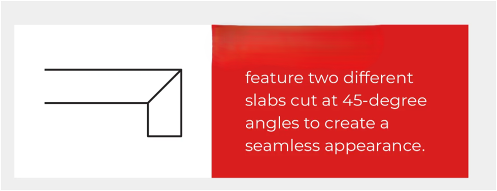 - Mitered Edge: Two slabs joined at a 45-degree angle to make the counter appear thicker — often used in waterfall countertops.